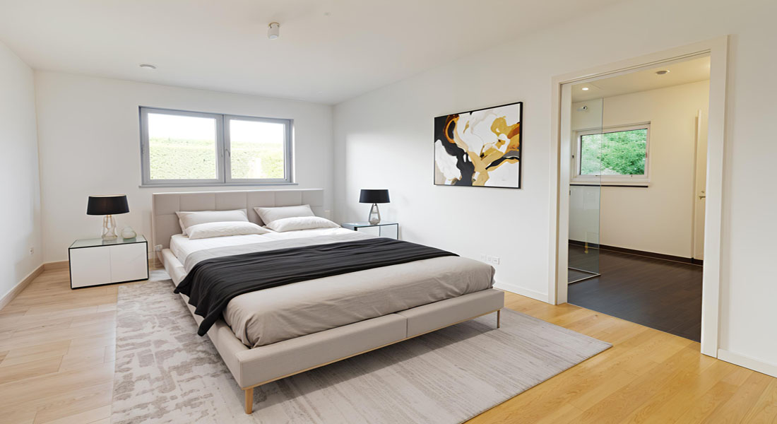 Ebenfalls sehr attraktiv ist das ca. 19 m² große Eltern-Schlafzimmer, welches am Ende des Flures liegt und mit einem großen Bad en Suite ausgestattet ist