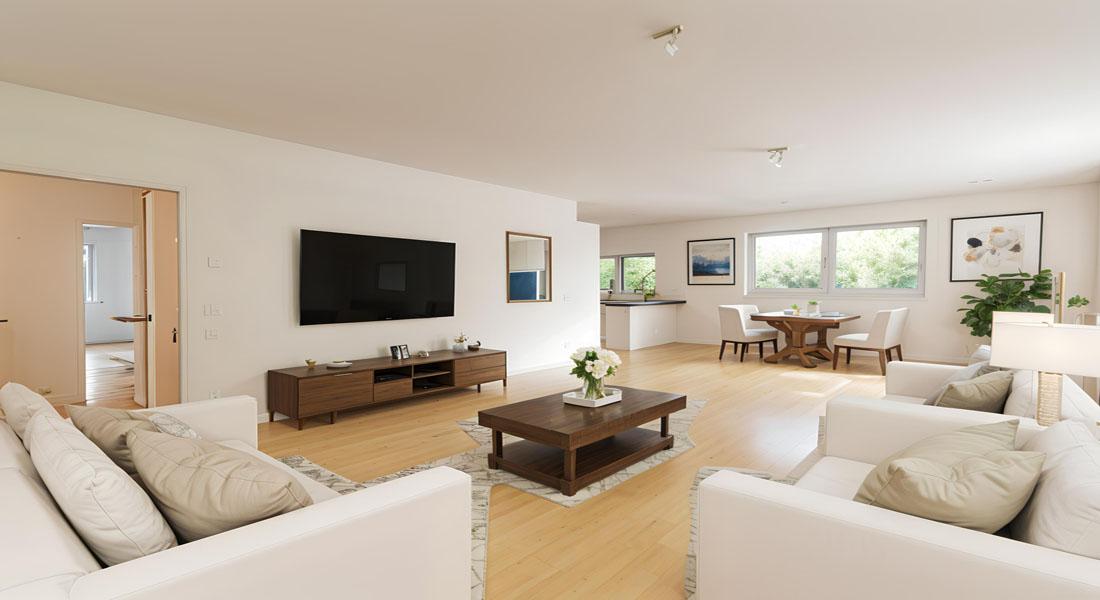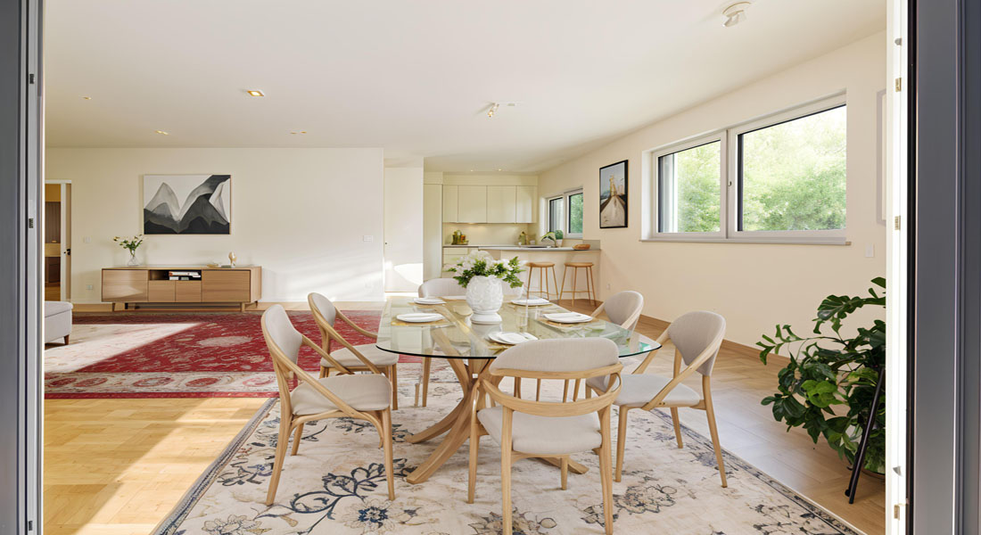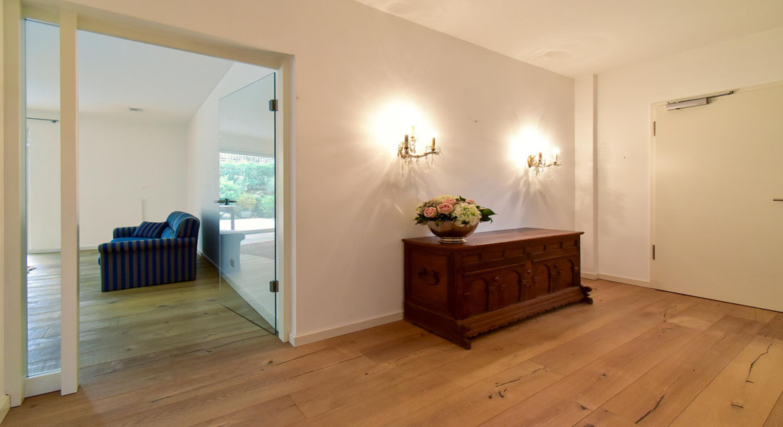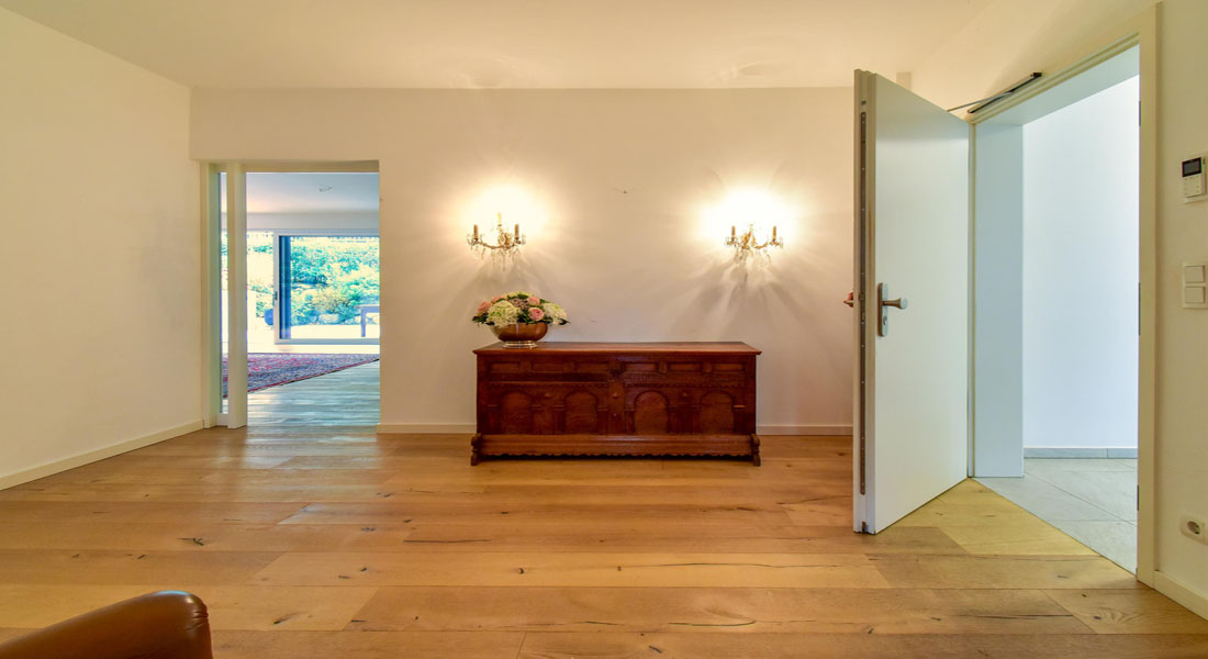 Bereits im Entree entsteht Begeisterung durch das hochwertige helle Eichenparkett, die 2,70 Meter hohen Decken und die glatten, weiß gestrichenen Wände – eine sehr moderne, lichtdurchflutete und gleichzeitig warme und einladende Wohnatmosphäre.