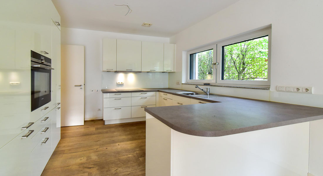 Die Küchenmöbel sind mit weißen Lackfronten und grauer Arbeitsplatte versehen. Herd, Backofen und Mikrowelle sind von der Firma Siemens, die Kühl-/Gefrierkombination ist von der Firma Liebherr. Die Küche verbleibt im Objekt und ist im Kaufpreis enthalten.