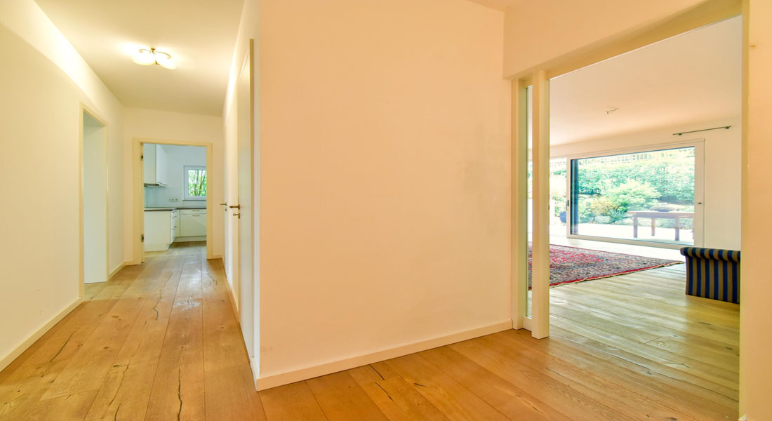Die großzügig aufgeteilte Wohnung liegt im Erdgeschoss und verfügt über 4 Zimmer, eine halboffene Küche, 2 Bäder und einen Hauswirtschaftsraum. Die Räume gehen teilweise vom Eingangsbereich und teilweise von dem großzügigen Flur ab.