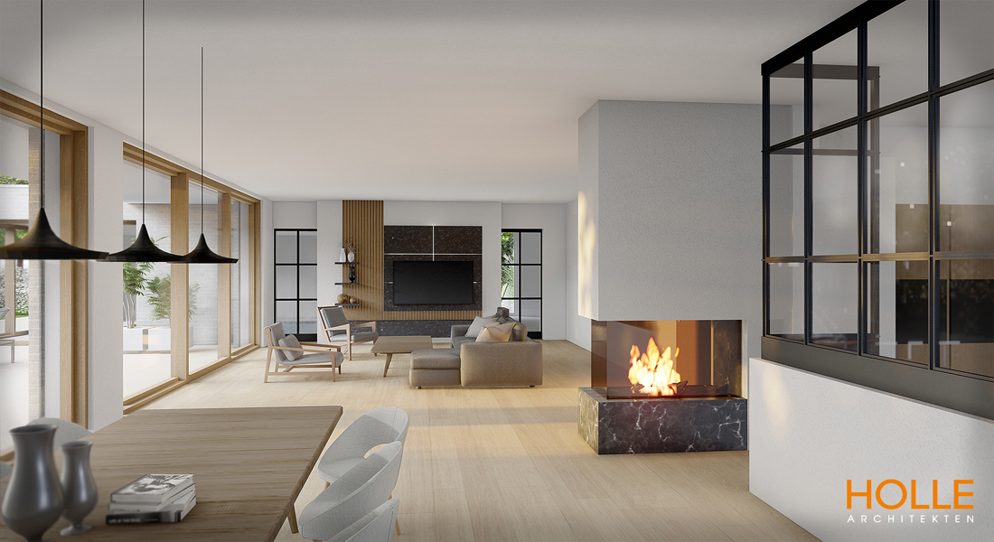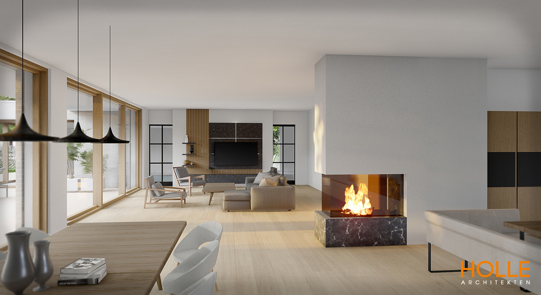 Nur ein freistehender Kaminblock trennt den Ess- und Wohnbereich optisch voneinander und ist zu drei Seiten hin nutzbar.