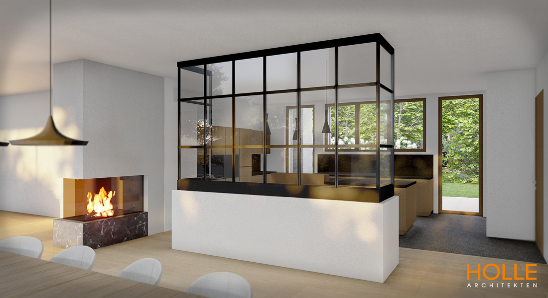 Die gradlinige, vom Essener Architekturbüro „HOLLE Architekten“ geplante Villa mit zwei Wohnetagen bietet Platz für eine Familie mit bis zu vier Kindern. Durch den abgeschlossenen Rohbau erhält man eine sehr gute Vorstellung davon, welches Bauvolumen hier umgesetzt wurde.